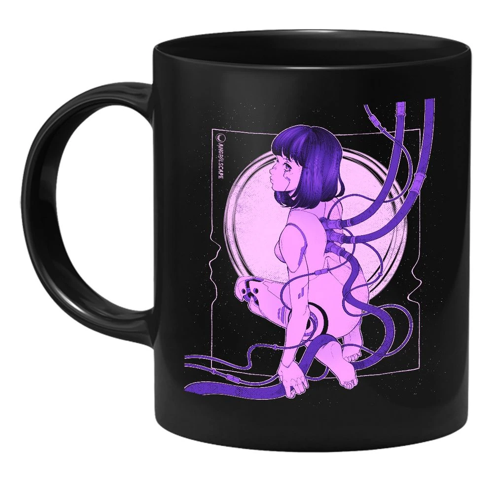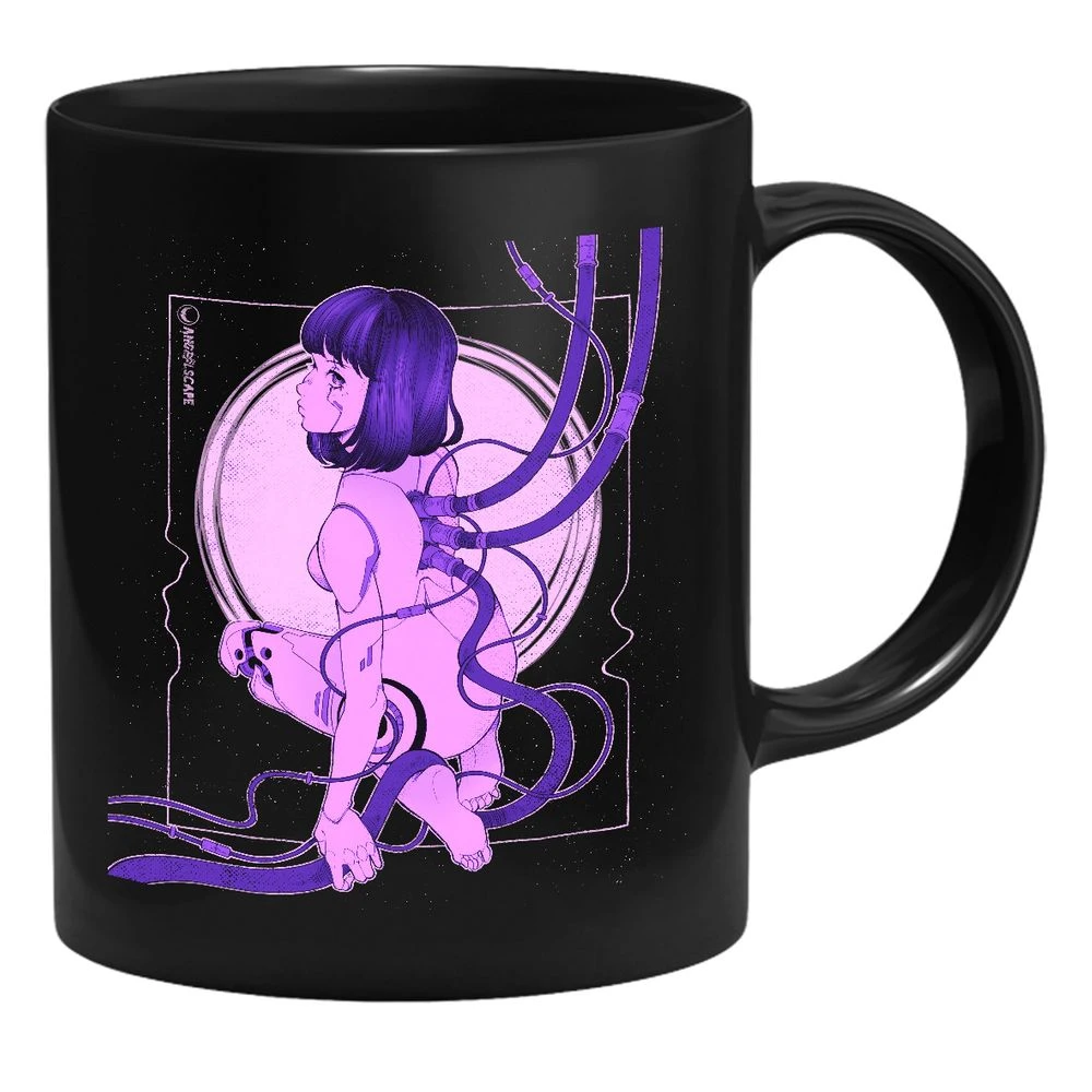 Die Tasse zeigt ein Androiden-Mädchen, welches noch an Schläuchen hängt.