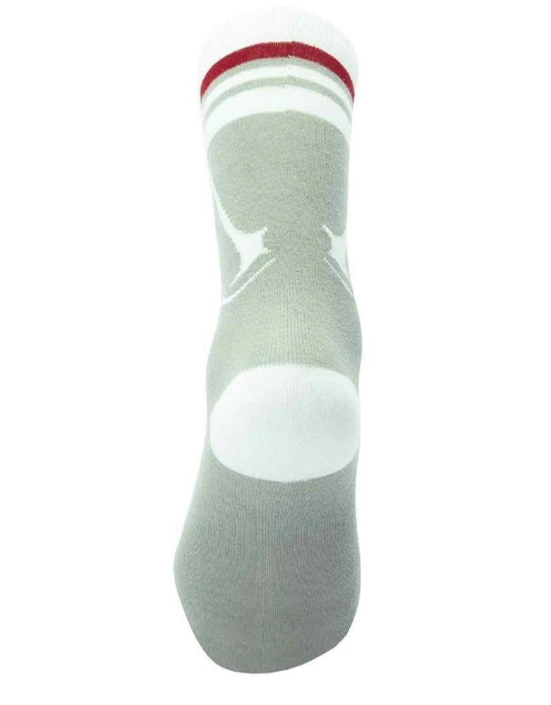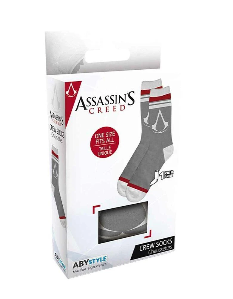 Graue Socken, die das Assassin’s Creed Logo zeigen.