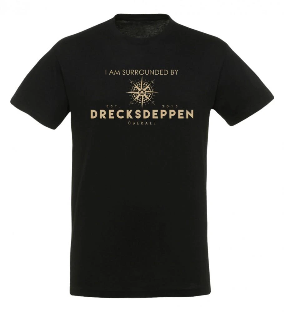 Das Shirt zeigt den Slogan „I am surrounded by Drecksdeppen!“.
