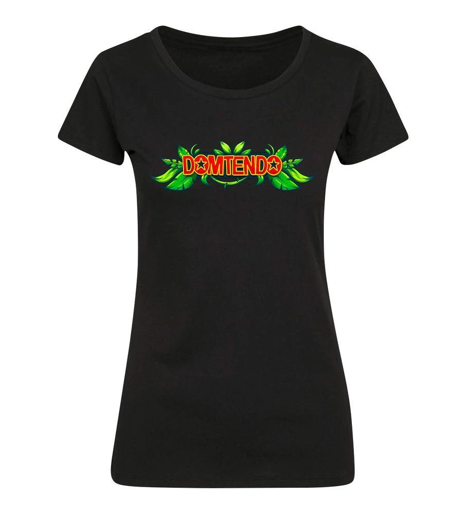 Das Shirt zeigt Domtendos Logo auf grünen Blättern.