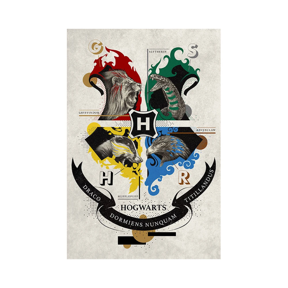 Das hochwertige Poster zeigt das Wappen von Hogwarts mit den Tieren der Häuser.
