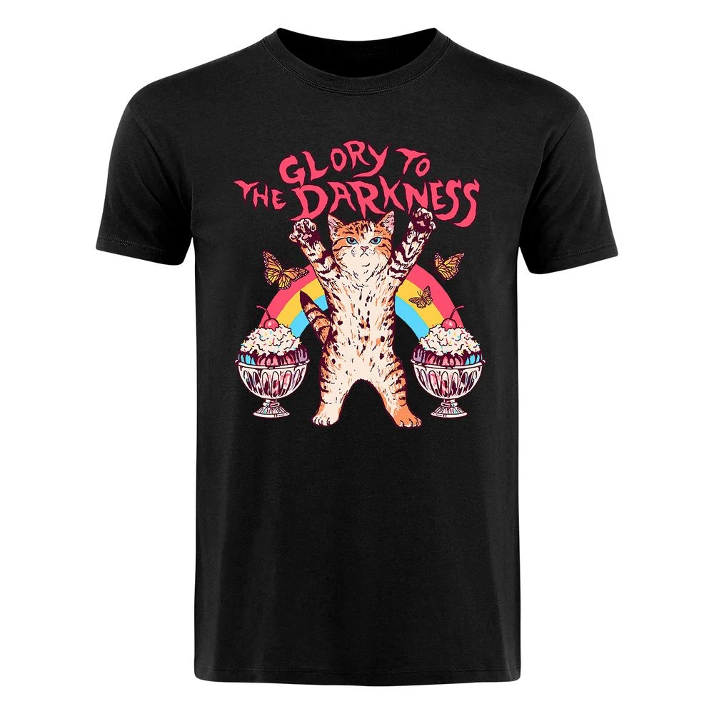 Das Shirt zeigt eine Katze mit zwei Eisbechern und dem Spruch „The Glory To Darkness“.