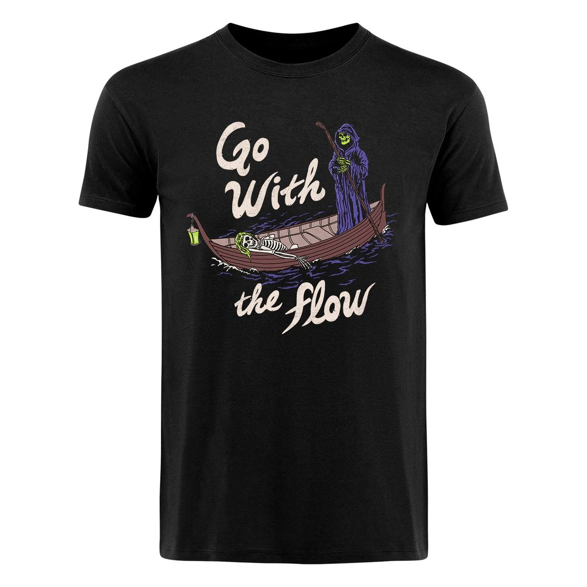 Das Shirt zeigt den Sensenmann und ein Skelett in einem Boot.