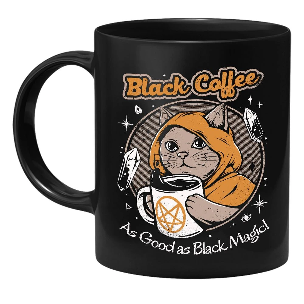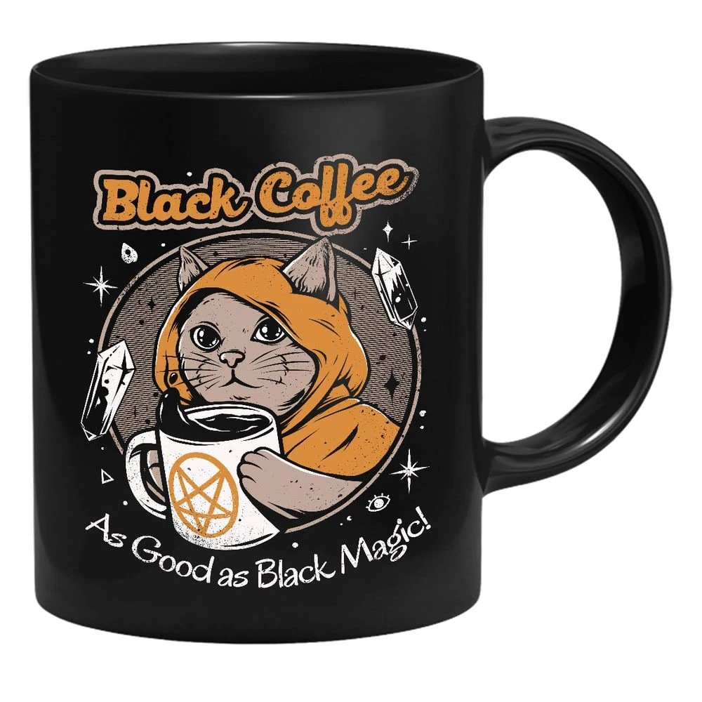 Die Tasse zeigt eine Katze mit Kapuze und Kaffeetasse. Außerdem liest man den Spruch Black Coffee As Good as Black Magic!