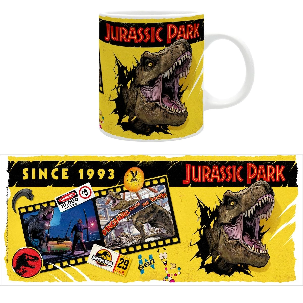 Die Tasse von Jurassic Park zeigt verschiedene Szenen mit dem T-Rex.