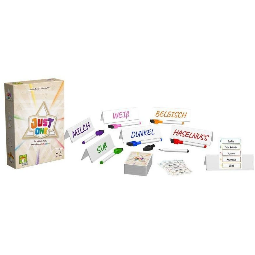 - Bei Just One spielt ihr alle gemeinsam gegen das Spiel. Ihr müsst kooperativ möglich viele der geheimen Wörter erraten. Die Spieler helfen sich gegenseitig mit Hinweis-Tafeln