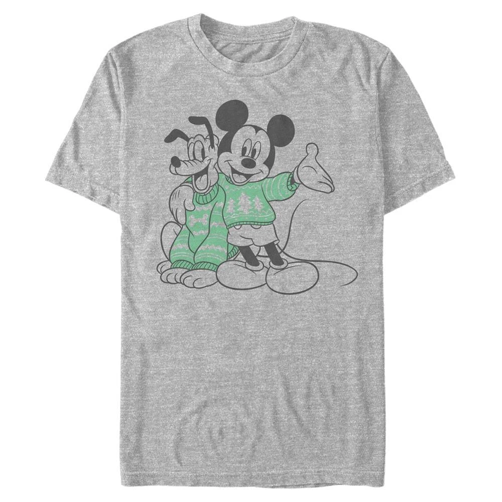 Das T-Shirt zeigt Pluto und Mickey in passenden Weihnachtspullovern.