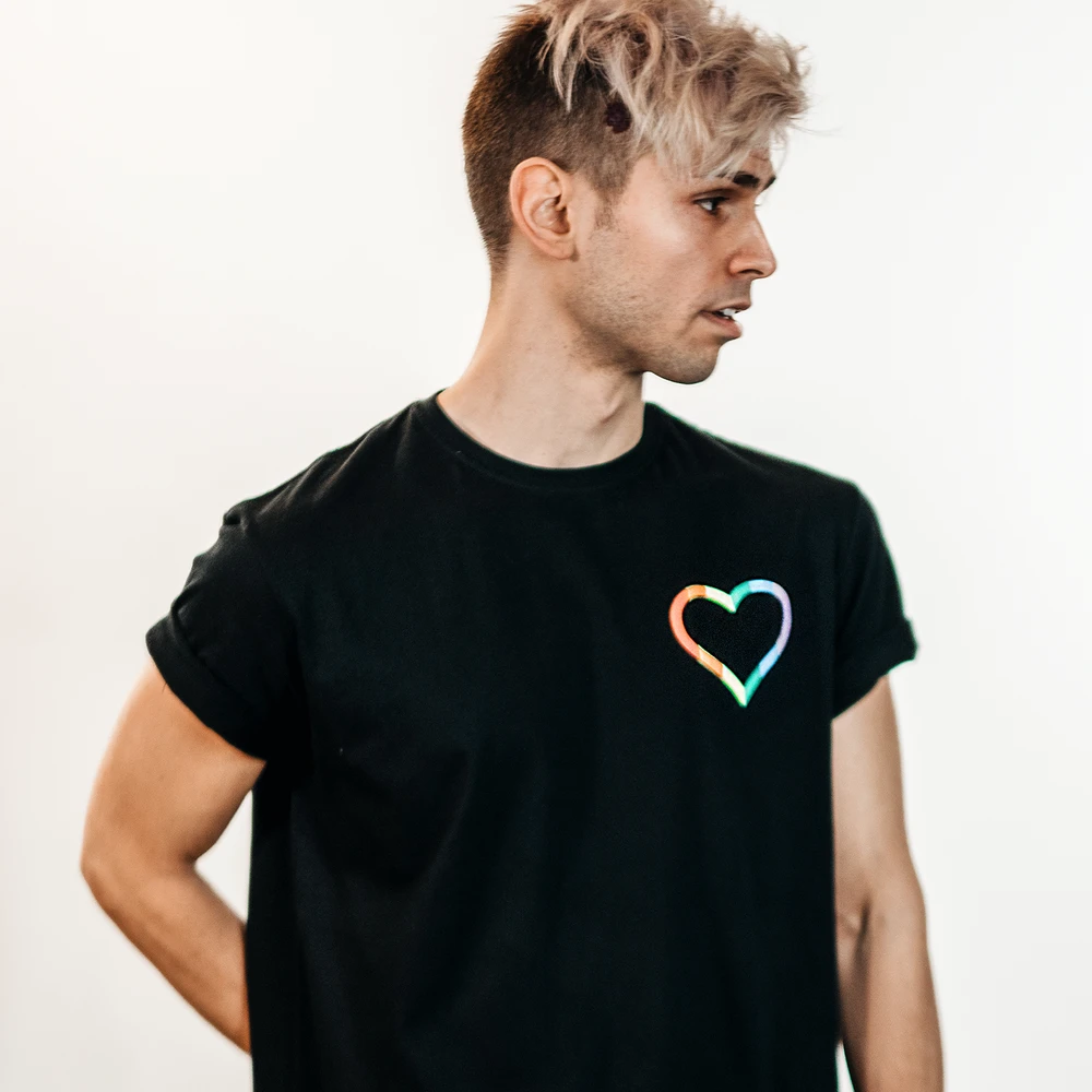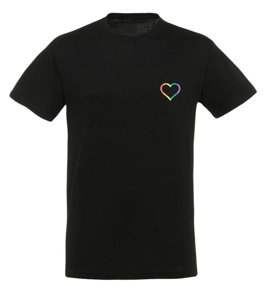 Das schwarze Shirt zeigt ein kleines Herz in Regenbogenfarben.