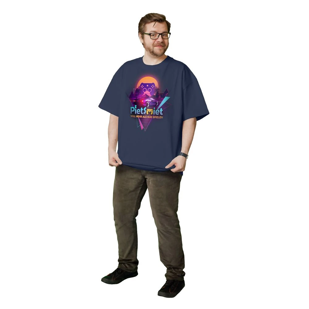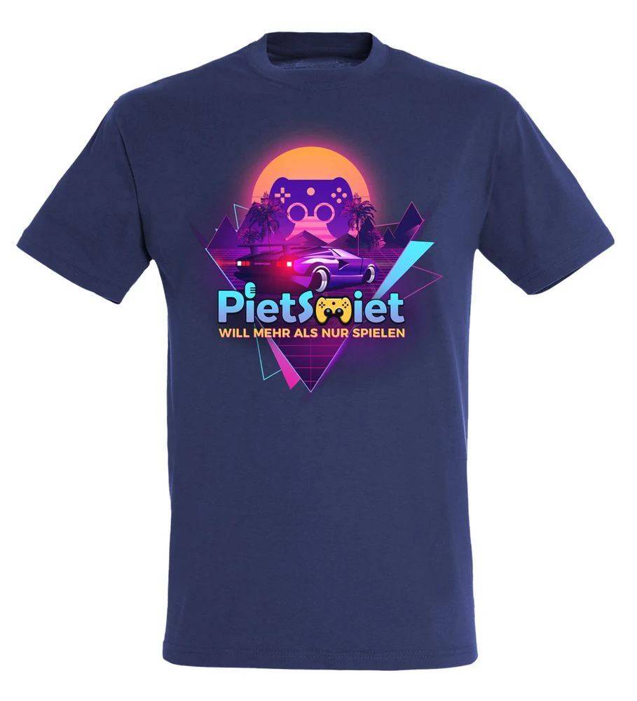 Das Shirt zeigt den PietSmiet Controller vor einem Auto mit dem Spruch „PietSmiet – Will Mehr Als Nur Spielen“.
