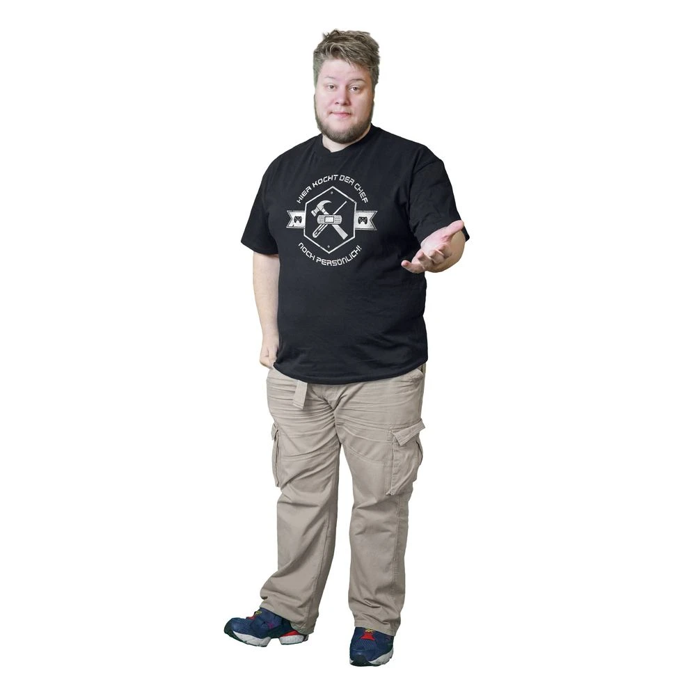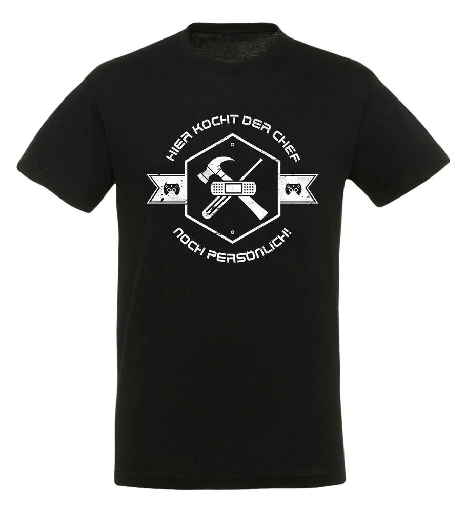 Das schwarze Shirt zeigt einen Hammer, einen Schraubenschlüssel und ein Pflaster umrahmt von dem Spruch: Hier Kocht Der Chef Noch Persönlich!
