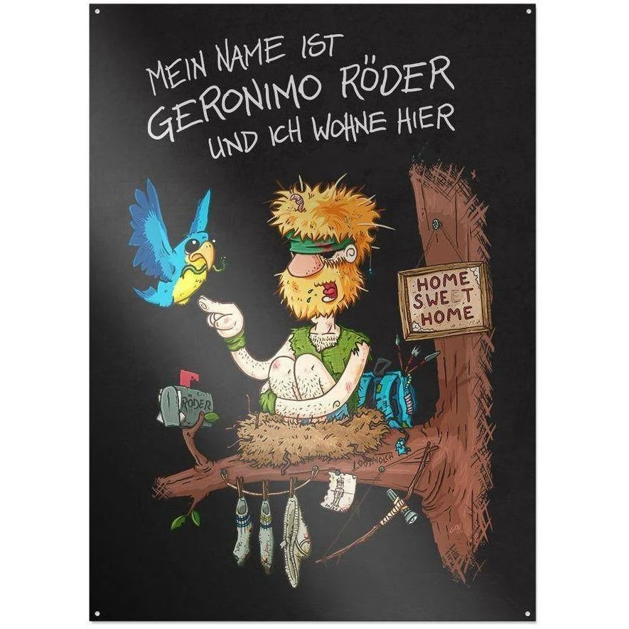 Auf dem Metallschild sieht man den Pen & Paper Charakter Geronimo Röder in einem Vogelnest auf einem Baum sitzen. Darüber steht der Spruch „Mein Name Ist Geronimo Röder Und Ich Wohne Hier“.