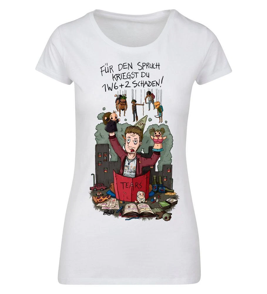 Das T-Shirt zeigt den Pen&Paper Spielleiter mit zwei Handpuppen und dem Satz Für Den Spruch Kriegst Du 1W6 + 2 Schaden!