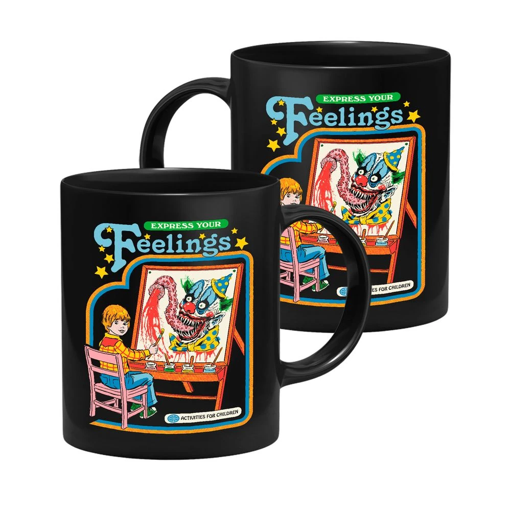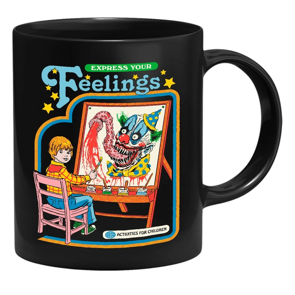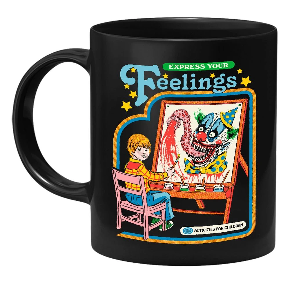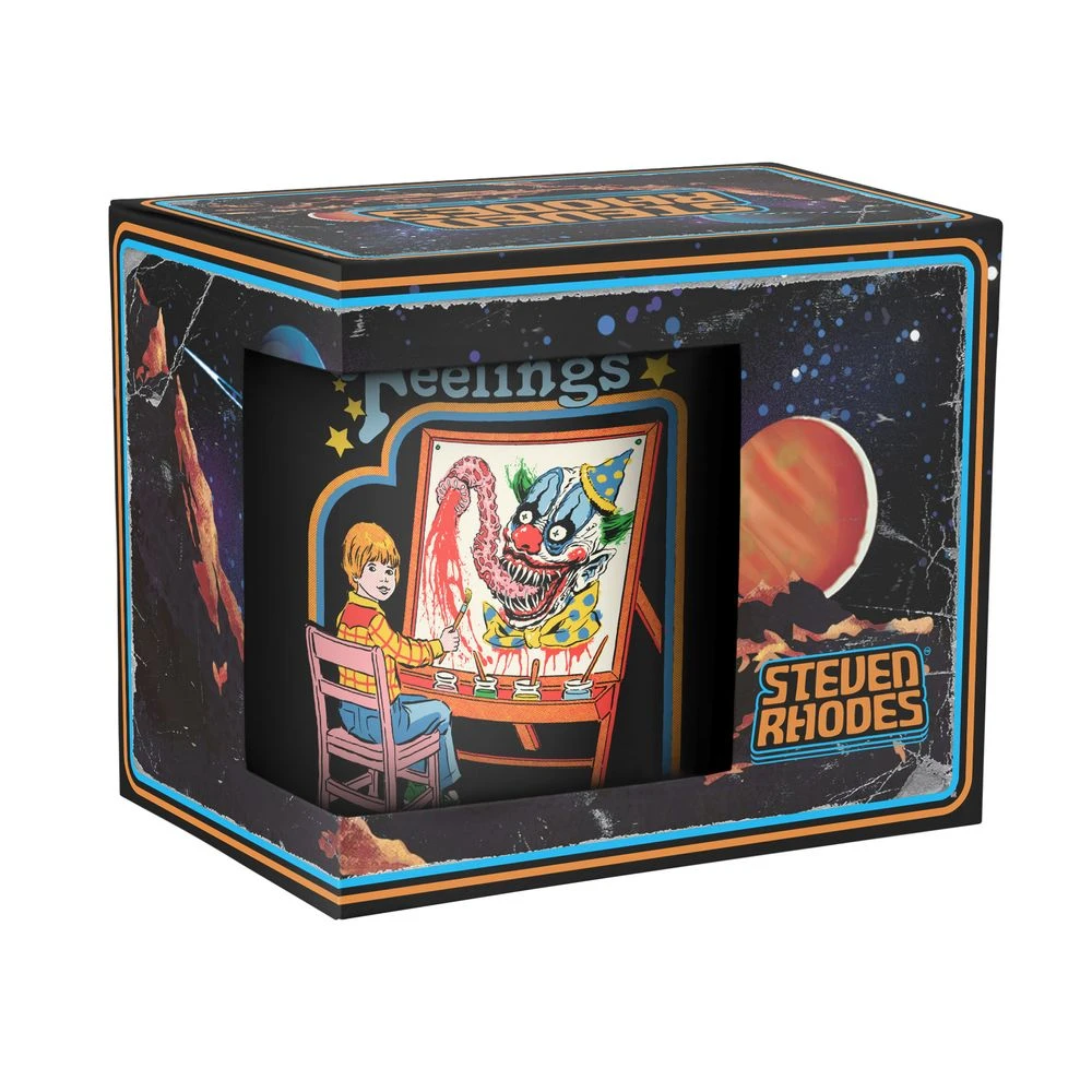Die Tasse zeigt einen Jungen, der einen Horror-Clown zeichnet.