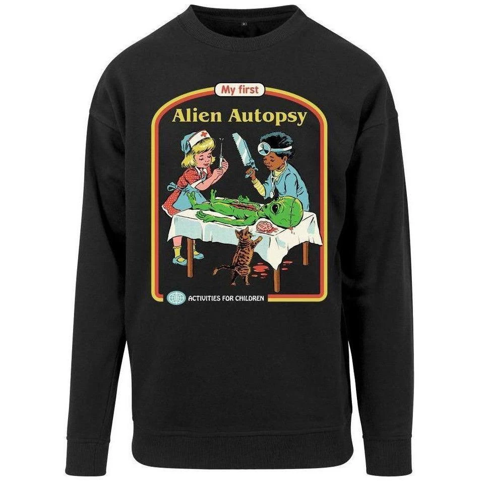 Der Sweater zeigt zwei Kinder, die ein Alien obduzieren. Oben steht der Text „My first Alien Autopsy“.