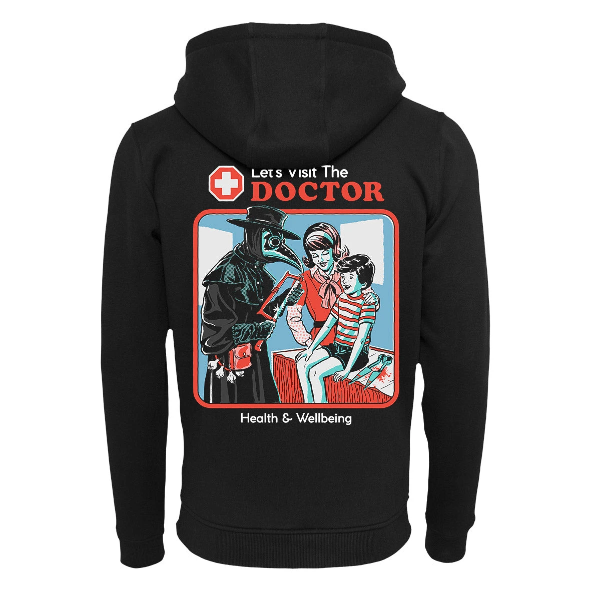 Der Hoodie zeigt einen Pestdoktor, der mit einer Säge vor einem kleinen Jungen steht.