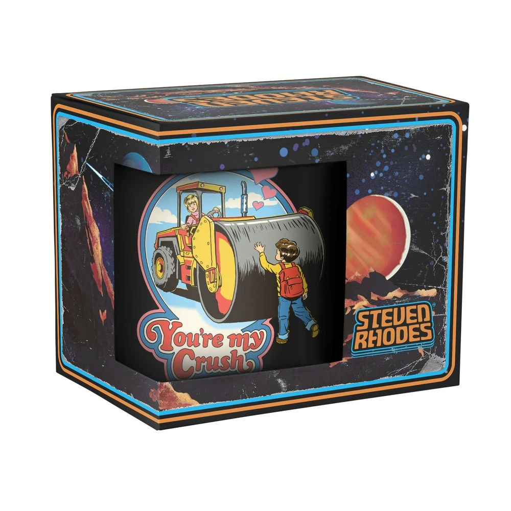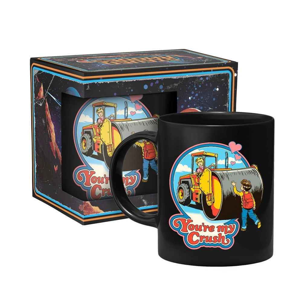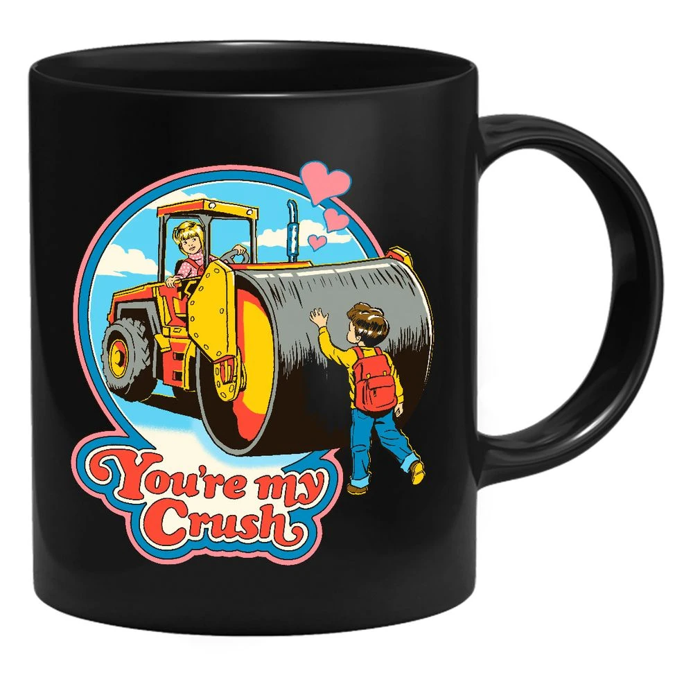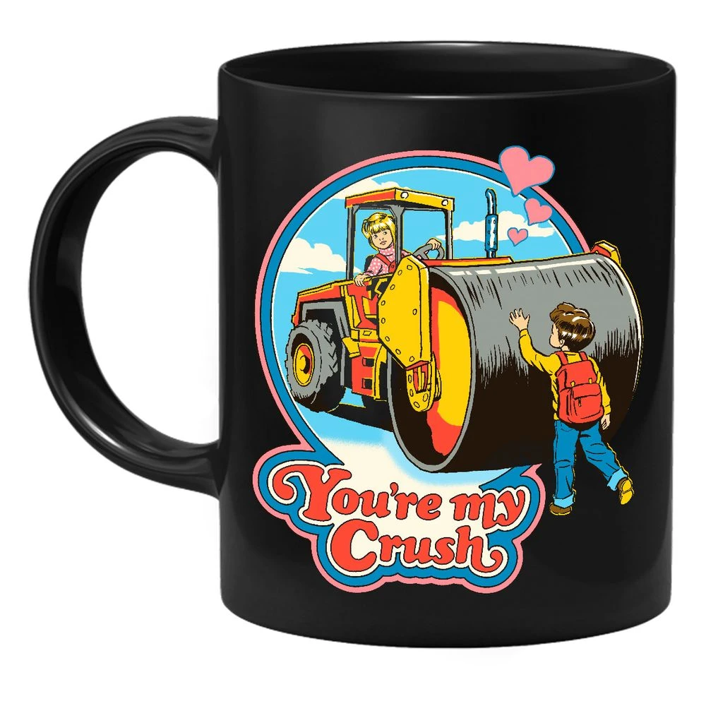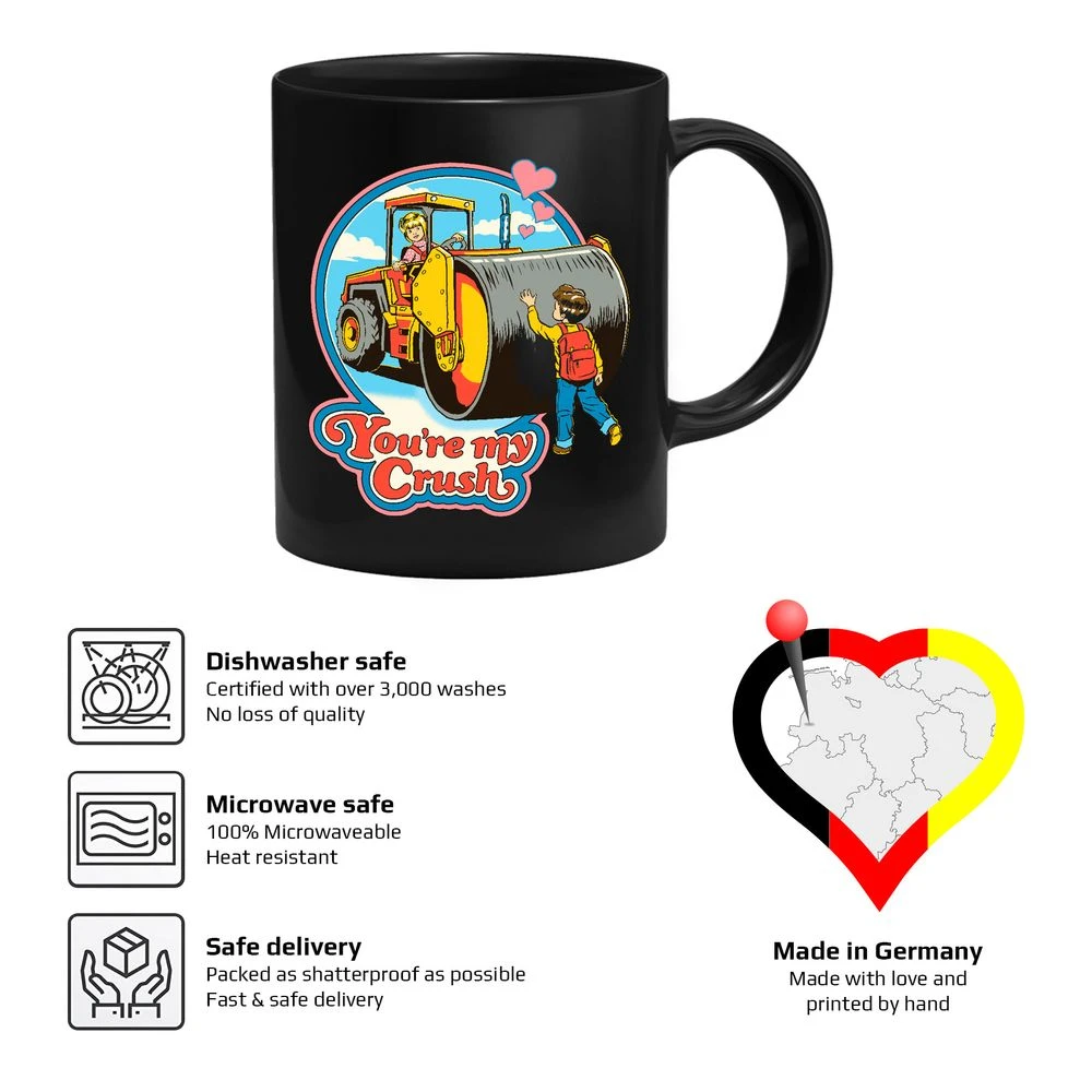 Die Tasse zeigt ein Mädchen, das auf einer Dampfwalze sitzt. Vor ihr steht ein Junge, der ihr zuwinkt.