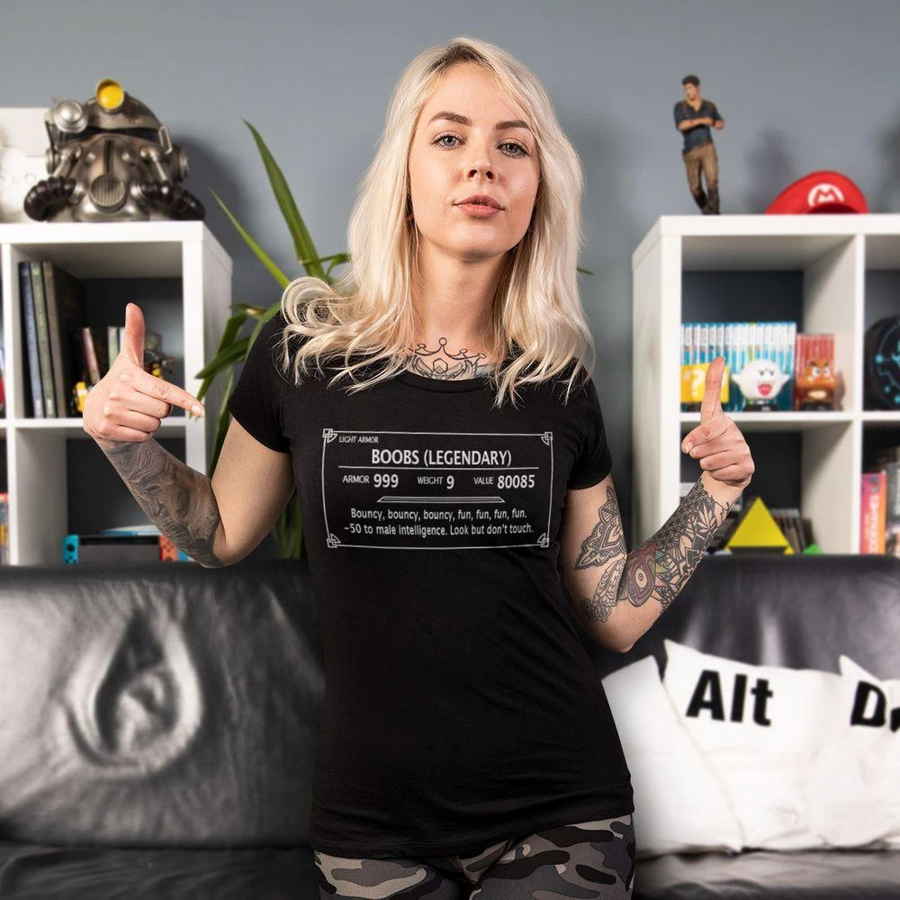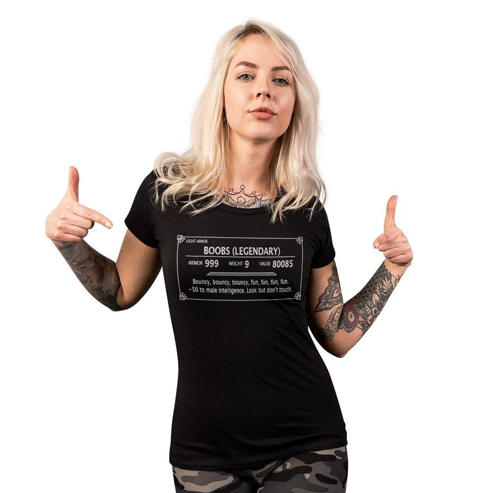 Schwarzes Girlshirt auf dem man „Legendary Boobs“ sieht.